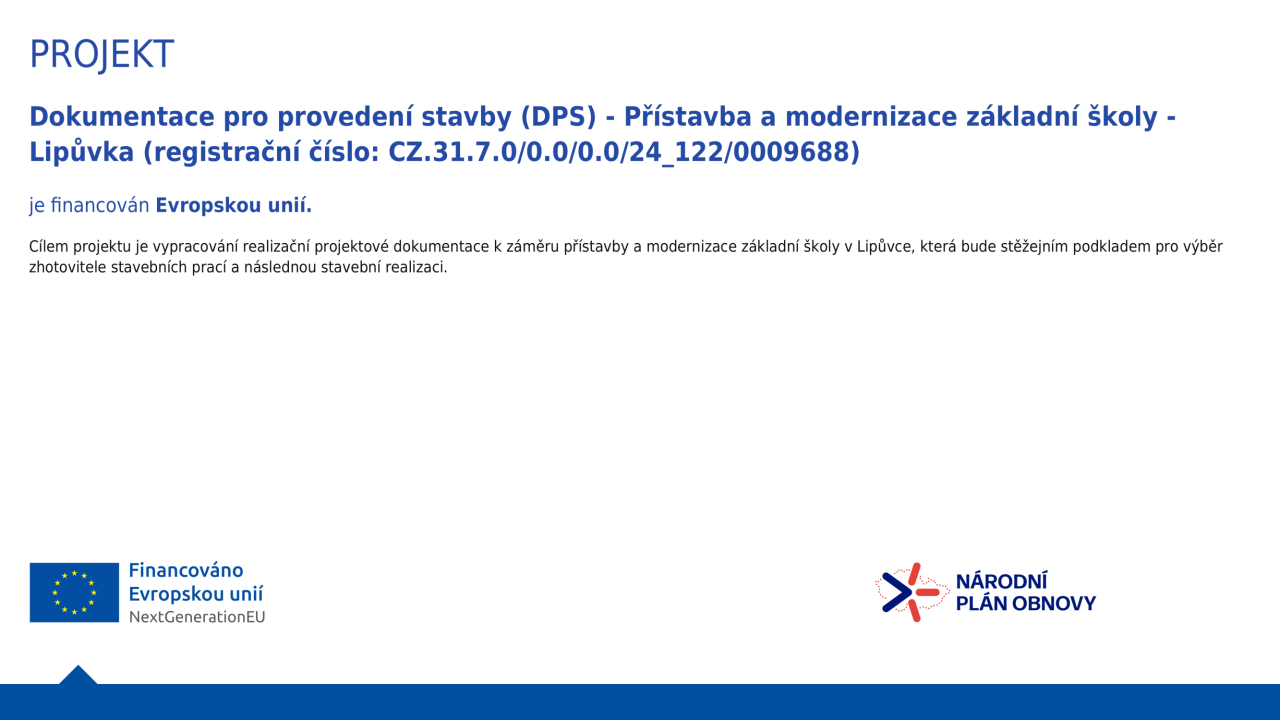 Cílem projektu je vypracování realizační dokumentace k záměru přístavby a modernizace základní školy v Lipůvce, která bude stěžijním podkladem pro výběr zhotovitele stavebních prací a následnou realizaci stavby.